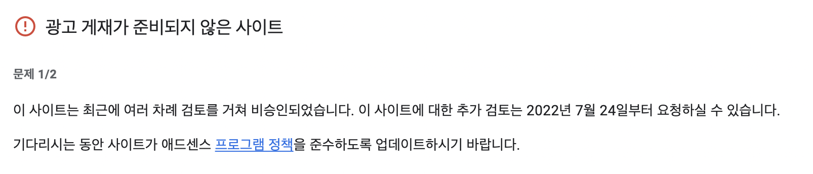 애드센스에서 퇴짜를 맞았다. 티스토리에 도메인을 입히고 애드센스 도전하면 대부분 2주, 늦어도 4주 안에는 바로 승인을 받아서 이번에도 조금 늦는 편이지만 당연히 받겠거니 생각했는데.