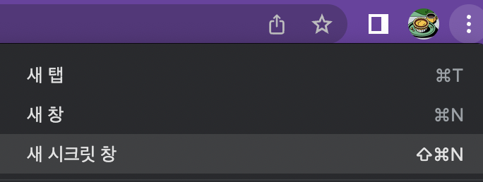 크롬 브라우저의 우측 상단에 점3개 버튼을 누르면, 새 탭, 새 창 그리고 새 시크릿 창이라고 있습니다. 여기서 '새 시크릿 창'을 선택하면 기존에 있던 쿠키 정보 등은 모두 없이 새로운 브라우저로 인식하게 됩니다.