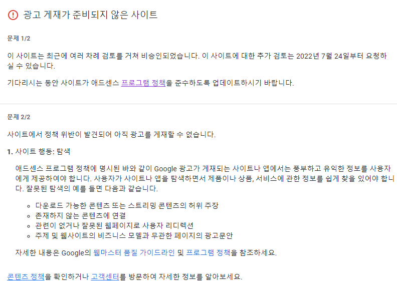 도메인으로 애드센스 승인 도전하면서 실패는 단 한 번도 안했는데, 드디어 실패 케이스가 나왔다. 더군다나 3번 밖에 광탈하지 않았음에도 불구하고, 자주 검토 신청했다고 한달하고도 보름을 기다린 후에나 신청하라고 한다. 치사한 애드센스구만.